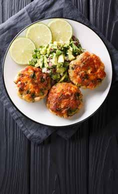4 Mash avocado until almost smooth. Add remaining coriander, mint and 1 tablespoon of lime juice. Mix well. Spoon a dollop of mixture onto each crab cake. Top with lime wedges. Serve hot or cold.
