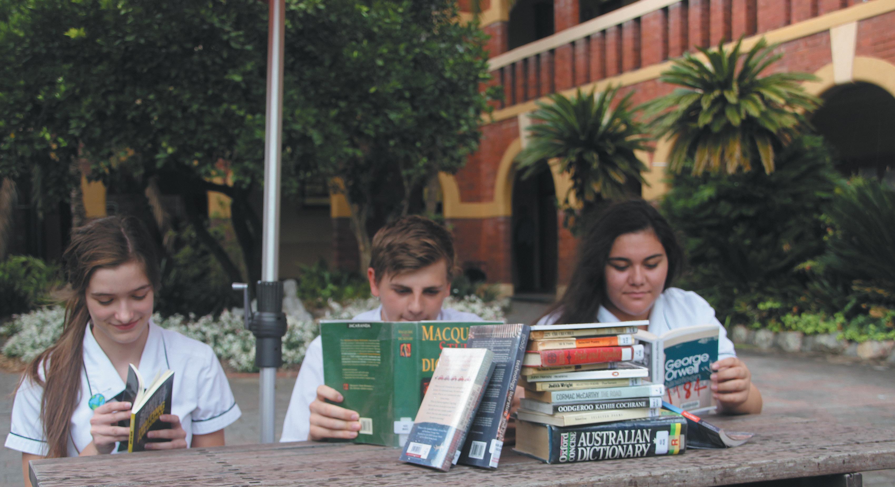 Paris Slade, Fletcher Harris and Kitana Tulaitu, immersed in the English curriculum at St Mary’s, Maitland. Photograph courtesy of Deborah Sivyer.
