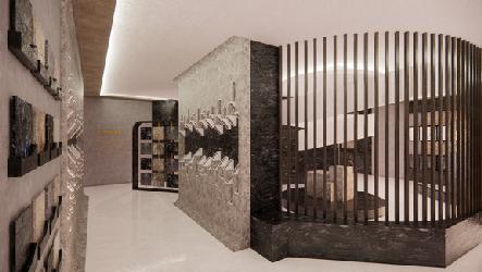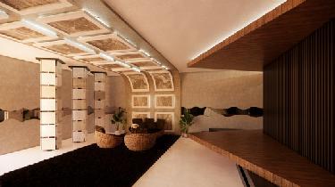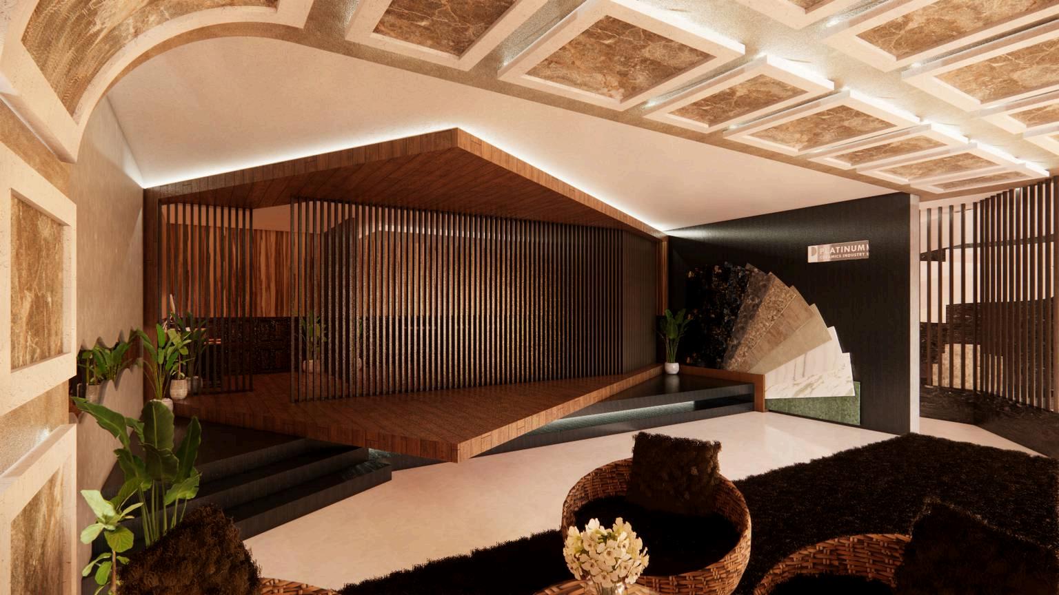 RUANGAN 1: ruangan yang pertama ini diperuntukkan sebagai tempat menerima tamu, ruang rapat, serta entrance utama gallery Keramik Platinum ini. Ruangan pertama ini memiliki konsep kontemporer yang dipadukan dengan beberapa material seperti kayu, batu, dan baja.