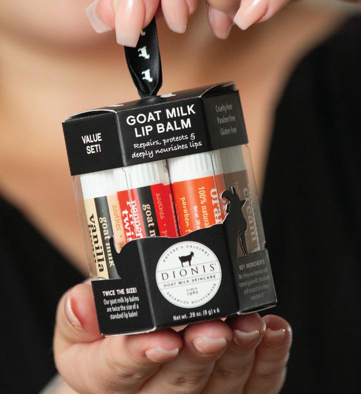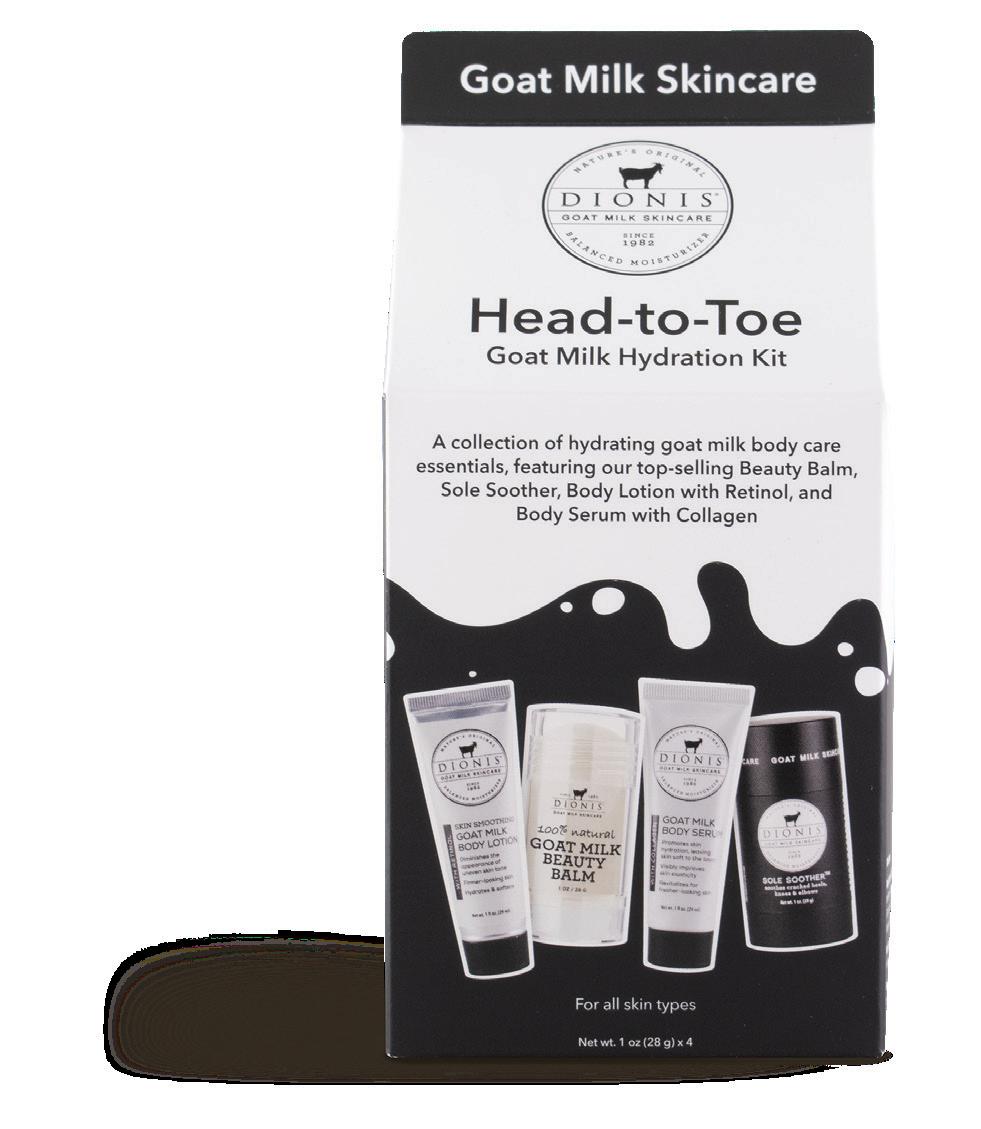 Features top-performing items including goat milk beauty balm, goat milk sole soother balm, goat milk body lotion with retinol and goat milk body serum with collagen to help smooth and refine your skin’s texture and enhances its radiance.