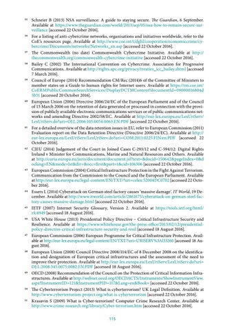 35 Schneier B (2013) NSA surveillance: A guide to staying secure. The Guardian, 6 September. Available at https://www.theguardian.com/world/2013/sep/05/nsa-how-to-remain-secure-sur‑ veillance [accessed 22 October 2016]. 36 For a listing of anti‑cybercrime networks, organisations and initiatives worldwide, refer to the CoE’s resources page. Available at http://www.coe.int/t/dghl/cooperation/economiccrime/cy‑ bercrime/Documents/networks/Networks_en.asp [accessed 22 October 2016]. 37 The Commonwealth (no date) Commonwealth Cybercrime Initiative. Available at http:// thecommonwealth.org/commonwealth-cybercrime-initiative [accessed 22 October 2016]. 38 Bailey C (2002) The International Convention on Cybercrime. Association for Progressive Communications. Available at http://rights.apc.org/privacy/treaties_icc_bailey.shtml [accessed 7 March 2016]. 39 Council of Europe (2014) Recommendation CM/Rec (2014)6 of the Committee of Ministers to member states on a Guide to human rights for Internet users. Available at https://rm.coe.int/ CoERMPublicCommonSearchServices/DisplayDCTMContent?documentId=09000016804d 5b31 [accessed 20 October 2016]. 40 European Union (2006) Directive 2006/24/EC of the European Parliament and of the Council of 15 March 2006 on the retention of data generated or processed in connection with the provi‑ sion of publicly available electronic communications services or of public communications net‑ works and amending Directive 2002/58/EC. Available at http://eur-lex.europa.eu/LexUriServ/ LexUriServ.do?uri=OJ:L:2006:105:0054:0063:EN:PDF [accessed 22 October 2016]. 41 For a detailed overview of the data retention issues in EU, refer to European Commission (2011) Evaluation report on the Data Retention Directive (Directive 2006/24/EC). Available at http:// eur-lex.europa.eu/LexUriServ/LexUriServ.do?uri=COM:2011:0225:FIN:en:PDF [accessed 22 October 2016]. 42 CJEU (2014) Judgement of the Court in Joined Cases C‑293/12 and C‑594/12: Digital Rights Ireland v Minister for Communications, Marine and Natural Resources and Others. Available at http://curia.europa.eu/juris/document/document.jsf?text=&docid=150642&pageIndex=0&d oclang=EN&mode=lst&dir=&occ=first&part=1&cid=106306 [accessed 22 October 2016]. 43 European Commission (2004) Critical Infrastructure Protection in the Fight Against Terrorism. Communication from the Commission to the Council and the European Parliament. Available at http://eur-lex.europa.eu/legal-content/EN/TXT/?uri=celex:52004DC0702 [accessed 22 Octo‑ ber 2016]. 44 Essers L (2014) Cyberattack on German steel factory causes ‘massive damage’. IT World, 19 De‑ cember. Available at http://www.itworld.com/article/2861675/cyberattack‑on‑german‑steel‑fac‑ tory‑causes‑massive‑damage.html [accessed 22 October 2016]. 45 IETF (2007) Internet Security Glossary, Version 2. Available at https://tools.ietf.org/html/ rfc4949 [accessed 18 August 2016]. 46 USA White House (2013) Presidential Policy Directive – Critical Infrastructure Security and Resilience. Available at https://www.whitehouse.gov/the-press-office/2013/02/12/presidentialpolicy-directive-critical-infrastructure-security-and-resil [accessed 18 August 2016]. 47 European Commission (2006) European Programme for Critical Infrastructure Protection. Avail‑ able at http://eur-lex.europa.eu/legal-content/EN/TXT/?uri=URISERV%3Al33260 [accessed 18 Au‑ gust 2016]. 48 European Union (2008) Council Directive 2008/114/EC of 8 December 2008 on the identifica‑ tion and designation of European critical infrastructures and the assessment of the need to improve their protection. Available at http://eur-lex.europa.eu/LexUriServ/LexUriServ.do?uri= OJ:L:2008:345:0075:0082:EN:PDF [accessed 18 August 2016]. 49 OECD (2008) Recommendation of the Council on the Protection of Critical Information Infra‑ structures. Available at http://webnet.oecd.org/OECDACTS/Instruments/ShowInstrumentView. aspx?InstrumentID=121&InstrumentPID=117&Lang=en&Book= [accessed 22 October 2016]. 50 The Cyberterrorism Project (2013) What is cyberterrorism? UK Legal Definition. Available at http://www.cyberterrorism-project.org/what-is-cyberterrorism [accessed 22 October 2016]. 51 Krasavin S (2009) What is Cyber‑terrorism? Computer Crime Research Center. Available at http://www.crime-research.org/library/Cyber-terrorism.htm [accessed 22 October 2016]. 115