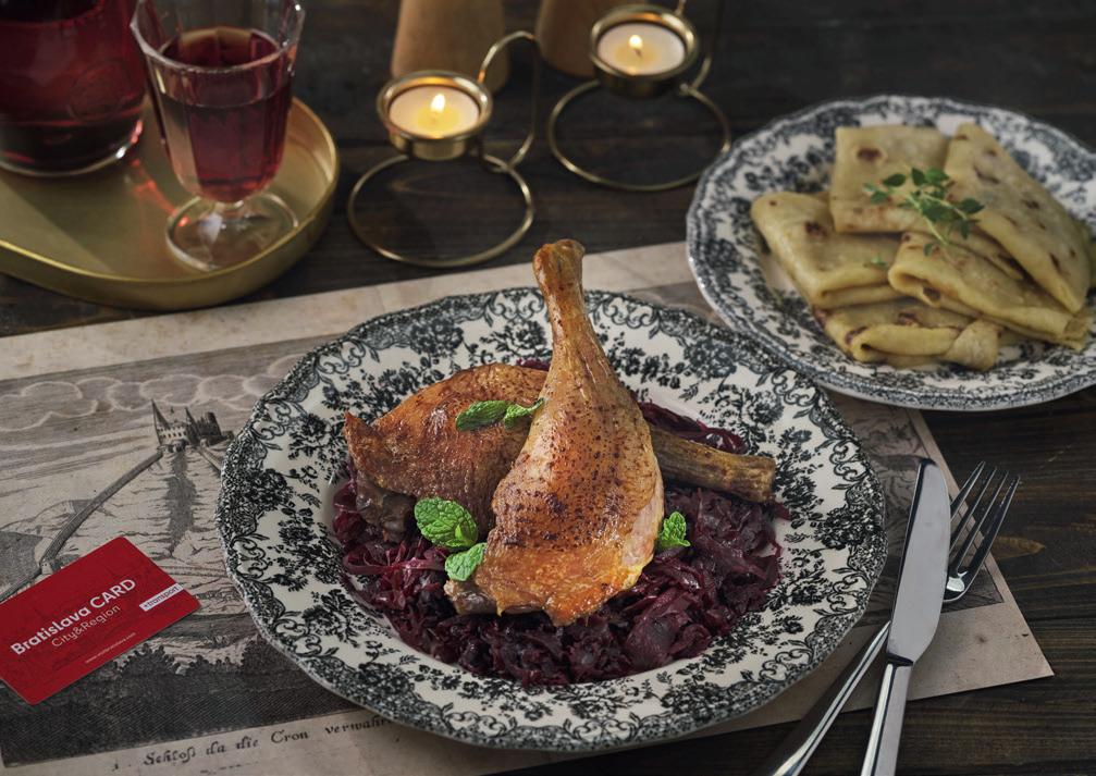 Every year, festivals celebrate the beginning of the harvest in other towns in the Lesser Carpathians – Svätý Jur, Pezinok and Modra. Wine lovers can enjoy a variety of wine tastings. During the fall, visitors can combine this with another local specialty – goose meat, which is roast goose or duck meat served with red cabbage and lokša, a flatbread made of potato dough. Lokša can also be eaten with a sweet poppy seed or jam filling.