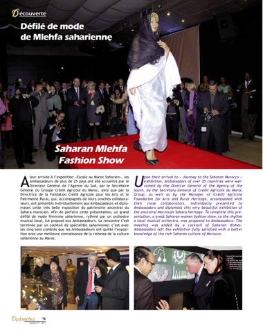 Saharan Mlehfa Fashion Show leur arrivée à l’exposition «Escale au Maroc Saharien», les Ambassadeurs de plus de 25 pays ont été accueillis par le Directeur Général de l’Agence du Sud, par le Secrétaire Général du Groupe Crédit Agricole du Maroc, ainsi que par la Directrice de la Fondation Crédit Agricole pour les Arts et le Patrimoine Rural, qui, accompagnés de leurs proches collaborateurs, ont présentés individuellement aux Ambassadeurs et diplomates cette très belle exposition du patrimoine ancestral du Sahara marocain. Afin de parfaire cette présentation, un grand défilé de mode féminine saharienne, rythmé par un orchestre musical local, fut proposé aux Ambassadeurs. La rencontre s’est terminée par un cocktail de spécialités sahariennes: c’est avec les cinq sens comblés que les Ambassadeurs ont quitté l’exposition avec une meilleure connaissance de la richesse de la culture saharienne au Maroc.