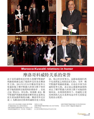 由于前科威特驻拉巴特大使穆罕默德萨 利赫祖维赫完成了他的外交任务在摩洛 哥王国,2011年3月31日摩洛哥驻华大 使递给他了穆罕默德六世国王陛下曾经 授予他的指挥官级的阿拉维勋章 。在此 之际 贾法尔。阿尔热。哈基姆 承认 穆 罕默德萨利赫祖维赫对摩科的友爱和友 谊关系加强所做的贡献。摩洛哥外交官 说 « 为推动拉巴特和科威特历史上的友 1-贾法尔-阿尔热-哈基姆大使递给 穆罕默德 萨利赫祖维赫大使大使阿拉维勋章 2-穆罕默德萨利赫祖维赫大使大使和夫人苏 阿黛.鲁美赫跟贾法尔。阿尔热。哈基姆大