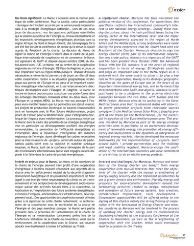 A significant choice. Morocco has thus welcomed the political version of this conference. For supervision, this specificity «reflects the international community’s interest in the national energy strategy». During these twoday discussions, about the main political issues facing the energy sector at the international level and the major energy developments expected in the region of North Africa and the Middle East, strong testimonies were made during the press conference that Mr. Douiri held with the President of the Charter. Morocco's decision to sign the Energy Charter forms part of its international cooperation and trade policy: Morocco is a signatory of the GATT and has been granted since October 2008, the Advanced Status with the EU. Morocco is at the heart of regional cooperation in terms of energy: EU-Maghreb countries and plays an important role in the MENA region as it is endowed with the same assets to allow it to play a key role in this cooperation. Owing to its strategic geographic situation at the gates of Europe and at the heart of an important international energy hub, and to its electricity interconnections with Spain and Algeria, Morocco is wellpositioned to be a platform in the growing electricity exchanges between the two sides, with Europe and the MENA region. Morocco aims at its anchoring in the EuroMediterranean area that its advanced status will allow it, its power generation projects from renewable sources comply with the Mediterranean Solar Plan, a flagship project of the Union for the Mediterranean, for the electrical integration of the Euro-Mediterranean area. The process initiated by Morocco as part of its energy strategy priorities aims in particular at an accelerated development of renewable energy, the promotion of energy efficiency and involvement in the dynamics of integration of regional energy markets. Having developed the necessary frameworks for the implementation of «projects» built around public / private partnerships with the visibility and legal stability required, Morocco enjoys the confidence of the international investors who have committed or are willing to do so within energy projects.