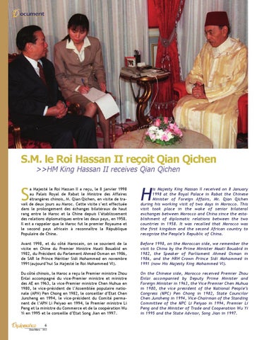 a Majesté le Roi Hassan II a reçu, le 8 janvier 1998 au Palais Royal de Rabat le Ministre des Affaires étrangères chinois, M. Qian Qichen, en visite de travail de deux jours au Maroc. Cette visite s’est effectuée dans le prolongement des échanges bilatéraux de haut rang entre le Maroc et la Chine depuis l’établissement des relations diplomatiques entre les deux pays, en 1958. Il est a rappeler que le Maroc fut le premier Royaume et le second pays africain à reconnaître la République Populaire de Chine.