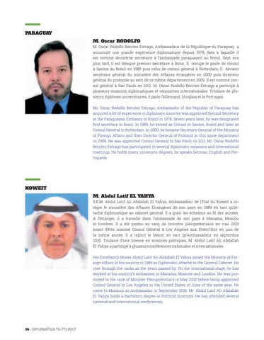 PARAGUAY M. Oscar RODOLFO M. Oscar Rodolfo Benitez Estrago, Ambassadeur de la République du Paraguay a accumulé une grande expérience diplomatique depuis 1978, date à laquelle il est nommé deuxième secrétaire à l’ambassade paraguayen au Brésil. Sept ans plus tard, il est désigné premier secrétaire à Bonn. Il occupe le poste de consul à Santos au Brésil en 1989 puis celui de consul général à Rotterdam. Il devient secrétaire général du ministère des Affaires étrangères en 2000 puis directeur général du protocole au sein de ce même département en 2009. Il est nommé consul général à Sao Paulo en 2011. M. Oscar Rodolfo Benitez Estrago a participé à plusieurs missions diplomatiques et rencontres internationales. Titulaire de plusieurs diplômes universitaires, il parle l’Allemand, l’Anglais et le Portugais. Mr. Oscar Rodolfo Benitez Estrago, Ambassador of the Republic of Paraguay has acquired a lot of experience in diplomacy since he was appointed Second Secretary at the Paraguayan Embassy in Brazil in 1978. Seven years later, he was designated first secretary in Bonn. In 1989, he served as Consul in Santos, Brazil and later as Consul General in Rotterdam. In 2000, he became Secretary General of the Ministry of Foreign Affairs and then Director General of Protocol in this same department in 2009. He was appointed Consul General to Sao Paulo in 2011. Mr. Oscar Rodolfo Benitez Estrago has participated in several diplomatic missions and international meetings. He holds many university degrees, he speaks German, English and Portuguese.