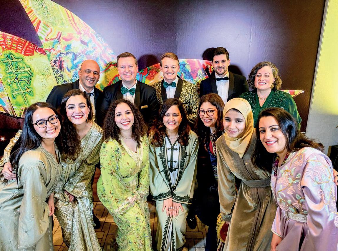 L’équipe de l’Ambassade d’Australie devant une toile de fond de l'Opéra de Sydney illuminé de motifs aborigènes