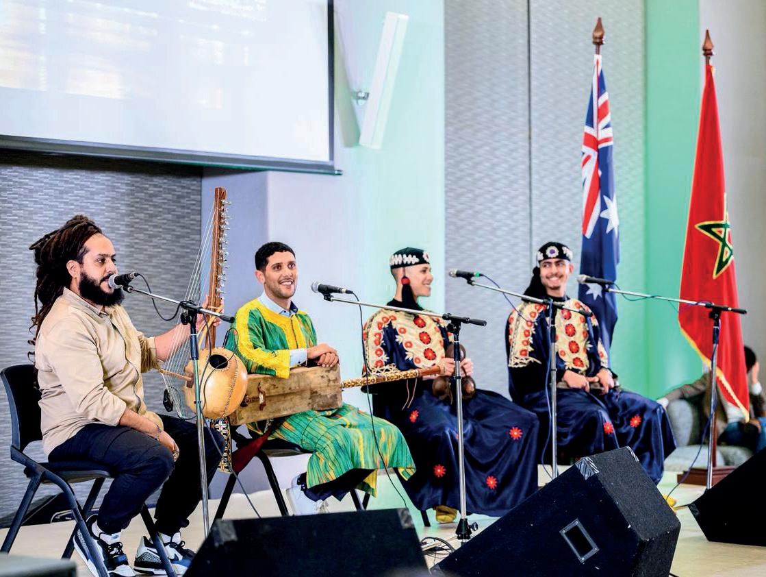 Julian Belbachir, artiste australo-marocain, et son groupe sur scène, partageant une performance de gnawa fusion