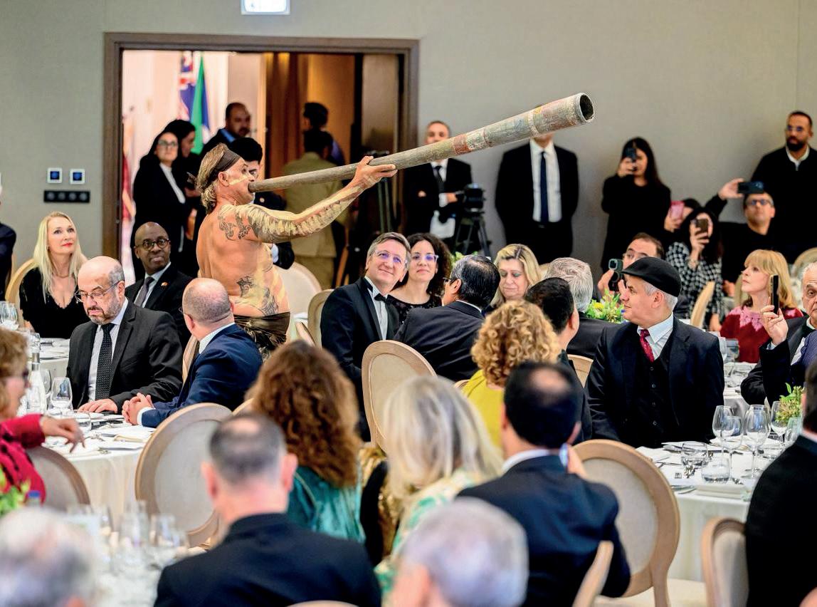 Dhinawan Baker, Australian First Nations artist and cultural ambassador, performing at the gala