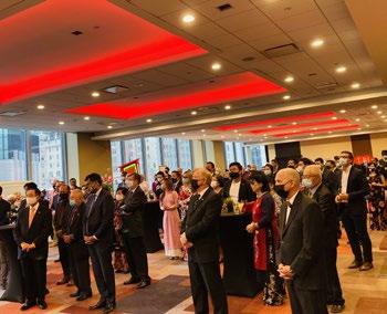 1. A flag-raising ceremony to commemorate the bicentennial celebration of the independence several Central American countries, including Costa Rica, Nicaragua, Honduras, El Salvador and Guatemala. This year, Panama and Dominican Republic also joined in the event, which took place at Ottawa City Hall. From left: Ambassadors Mauricio Ortiz Ortiz (Costa Rica), Romy Vasquez (Panama), Maurizio Carlo Gelli (Nicaragua), Sofia Cerrato (Honduras), Ottawa Mayor Jim Watson, Ambassadors Ricardo Alfonso Cisneros Rodriguez (El Salvador), Guisela Atalida Godinez Sazo (Guatemala) and Michelle Cohen (Dominican Republic) attended. (Photo: Ülle Baum) 2. On the occasion of the 76th National Day of Vietnam, Ambassador Pham Cao Phong (right) and Madame Van Thi Le Hien hosted a large in-person reception and photography exhibition at the Westin Hotel. (Photo: Ülle Baum) 3. A full view of the Vietnam gathering, with social distancing. (Photo: Ülle Baum) 4. To mark the 76th Anniversary of Indonesia’s independence, chargé d'affaires Yulastiawarman Zakaria and his wife, Wiene Andriyana, hosted a reception and a musical performance at Wisma Indonesia in Rockcliffe Park. (Photo: Ülle Baum) 5. At the Indonesian event, third secretary I Made Diangga (left) and second secretary Sri Remaytin wear traditional costumes. (Photo: Ülle Baum)