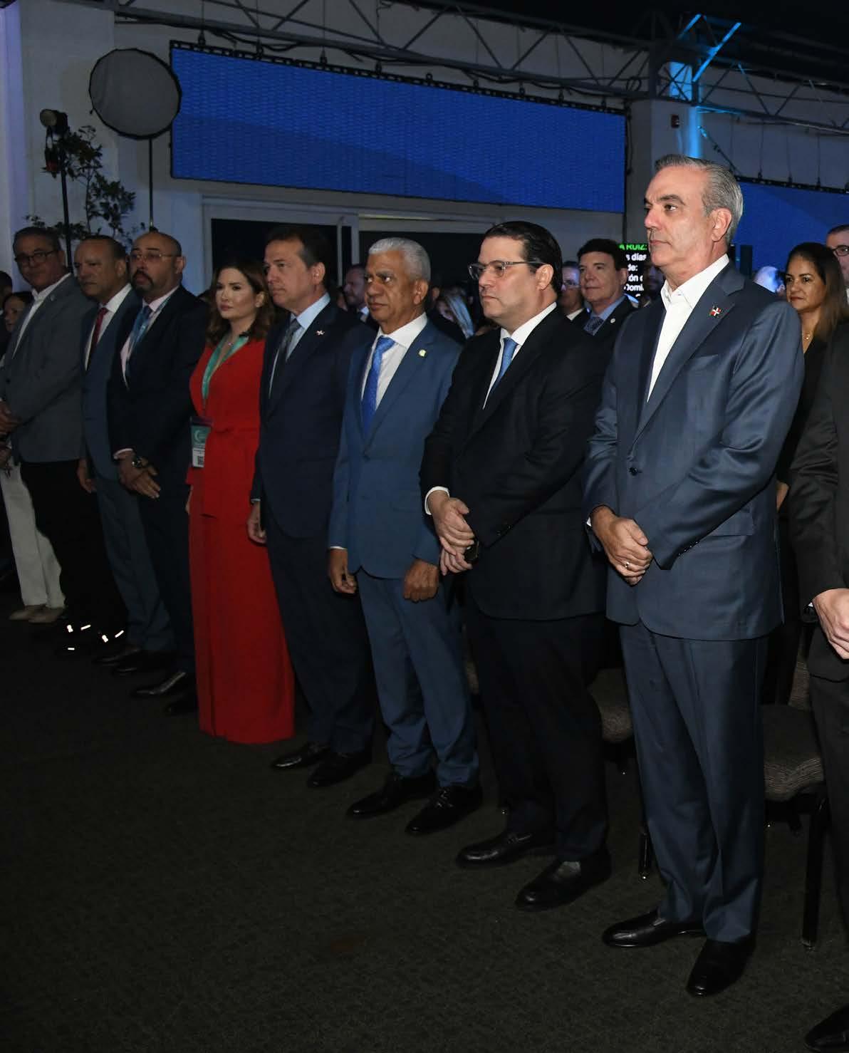 El presidente de la República, Luis Abinader, mientras encabeza el acto inaugural de la Torre 7 Mares en la Ciudad Destino Cap Cana, donde además asistió el presidente de la Cámara de Diputados, Alfredo Pacheco, y otras personalidades.