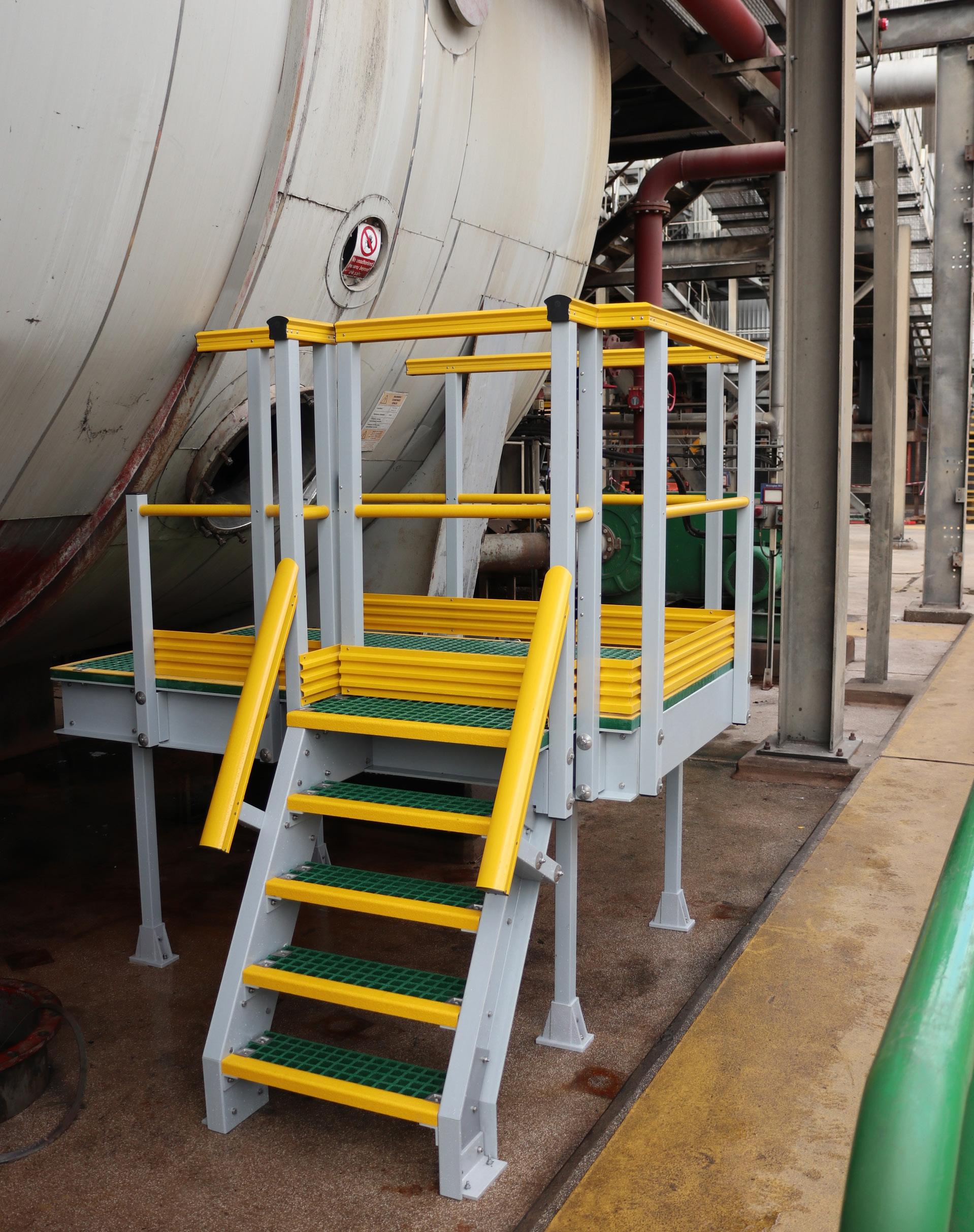 tread grating in the design of all our fibreglass Stairs and Access Platforms This stair tread is manufactured from 38mm thick grating with an integral solid reinforced nosing for optimal slip resistance Every stair and access platform we design and manufacture is corrosion and weather-resistant which means it requires minimal maintenance, even if it’s located outside
