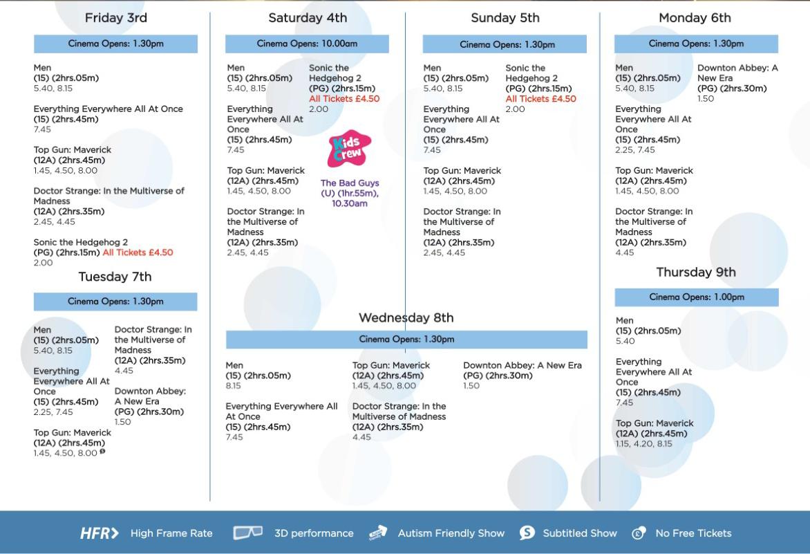 Cinema doors open daily 15 minutes before the first performance of the day and opening times can be found above. The Box Office for the days performances closes 15 minutes after the last film of the evening has commenced.