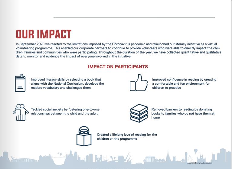 The report identifies some of the key outcomes from the programme such as improved literacy skills, improved confidence in reading and a renewed love of reading amongst the participants and highlights headline stats: • Together we delivered 256 hours of voluntary reading time.
