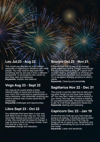Sagittarius Nov 22 - Dec 21 This month is just the right time to start sorting other things out you have been putting off. You may feel I need to have a revamp in your home, this may also involve a clearing for yourself emotionally. Should be a chance to get rid of all those paperwork issues too. Keywords clearing and cleansing