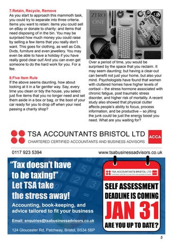 Over a period of time, you would be surprised by the space that you reclaim. It may seem daunting; but having a clear-out can benefit not just your home, but also your 8.Five Item Rule mind. Psychologists have found that women If the above seems daunting, how about with cluttered homes have higher levels of looking at it in a far gentler way. Say, every cortisol – the stress hormone associated with time you clean or tidy the house, you select chronic fatigue, post traumatic stress just five items that you no longer need and set disorder, and higher risk of mortality. A recent them aside in a box or bag, or the boot of your study also showed that physical clutter car ready for you to drop off when your next affects people’s ability to focus, process passing a charity shop? information, and be productive – so jilting the junk could be just the energy boost you need. What are you waiting for?