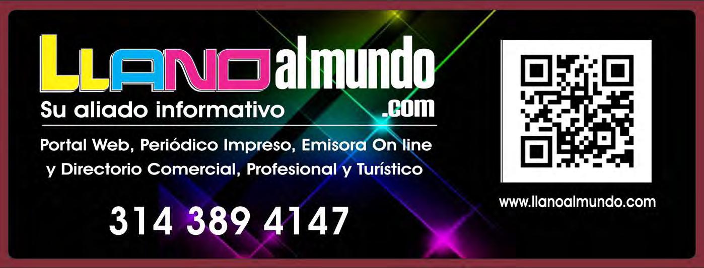 EDICIÓN 63 / 2023 LÉALO Y COMPÁRTALO PUBLICACIÓN MENSUAL ISSN 2422-1198 CONOCE LAS NOTICIAS DEL DÍA A DÍA EN NUESTRO PORTAL WEB WWW.LLANOALMUNDO.COM pueblo de amor, paz, fuerza y esperanza. Central de Abastos de Villavicencio Local F 10-02/03 Pescados y Mariscos Domicilios 311 230 6424 5 Pág. Ver más “Me alquilo para soñar”: Cabeto 14 Pág. Ver más Disfruta de sabores únicos con “Encanto” 13 Pág. Ver más El Meta la ruta natural de Colombia “Somos
