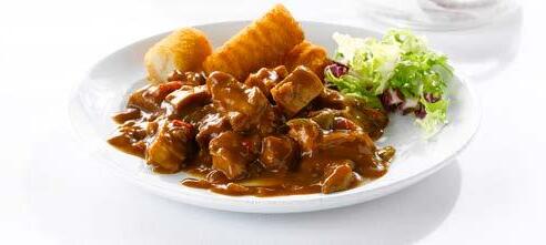 Gemarineerde kip in combinatie met een typische goulashsaus op basis van ui, paprika en tomaat.