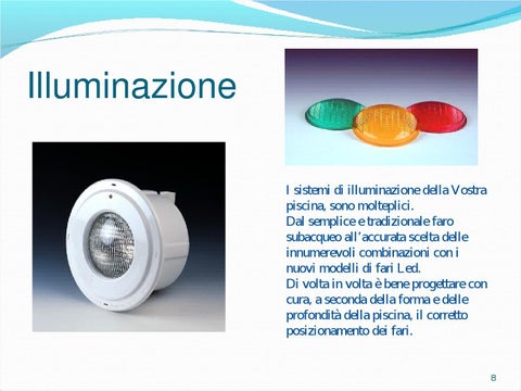 Illuminazione I sistemi di illuminazione della Vostra piscina, sono molteplici. Dal semplice e tradizionale faro subacqueo all’accurata scelta delle innumerevoli combinazioni con i nuovi modelli di fari Led. Di volta in volta è bene progettare con cura, a seconda della forma e delle profondità della piscina, il corretto posizionamento dei fari.