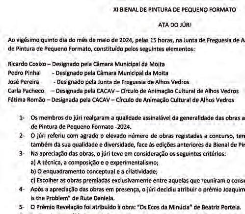 Aos membros do júri que apreciaram e selecionaram os trabalhos concorrentes a esta XI BIENAL DE PINTURA DE PEQUENO FORMATO, endereçamos os nossos agradecimentos, realçando o seu empenho e sentido de responsabilidade, contribuindo assim para a afirmação de um projeto cultural, que muito dignifica a nossa comunidade.