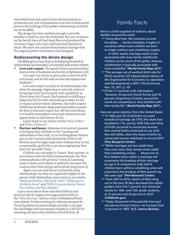 Family Facts Here is a brief snapshot of statistics about families around the world: • “Using data from 100 countries around the globe, … family instability is higher in countries where more children are born to single mothers and cohabiting couples. … In other words, marriage seems to be associated with more family stability for children across much of the globe, whereas cohabitation is typically associated with more instability” (World Family Map 2017). • “The average out-of-wedlock birth rate for OECD countries [35 industrialized nations of the Organisation for Economic Co-operation and Development] is 40%” (The Economist, Nov. 25, 2017, p. 16). • Of the 17 countries with information, “between 30 percent (South Korea) and 78 percent (Argentina) of adults around the world are completely or very satisfied with their family life” (World Family Map 2017). Here are some statistics from the United States: • “In 1960, just 5% of all births occurred outside of marriage. By 1970, this share had doubled to 11%, and by 2000 fully one-third of births occurred to unmarried women. Non-marital births continued to rise until the mid-2000s, when the share of births to unmarried women stabilized at around 40%” (Pew Research Center). • “While marriages are less stable than they once were, they remain more stable than cohabiting unions. … About one-infive children born within a marriage will experience the breakup of that marriage by age 9. In comparison, fully half of children born within a cohabiting union will experience the breakup of their parents by the same age” (Pew Research Center). • “From 2015 to 2016, reports of illicit drug use in the past 30 days decreased for eighth graders from 8 to 7 percent, but remained steady for 10th- and 12th-grade students, at 16 percent and 24 percent in 2016” (Childstats.gov). • “Today 28 percent of households have just one person living in them—an increase from 13 percent in 1960” (U.S. Census Bureau).