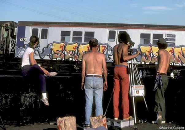 we were turned down for a grant from the National Endowment for the Humanities due to the opposition of the right-wing chairman, William Bennett. Our first funders were Channel 4 in Britain. But Mayor Koch, to his credit, got on board, and his ok allowed us to work with the Transit and police departments and get limited access to the tunnels and yards. We had to promise we wouldn’t shoot any illegal painting. When Cap on his own initiative painted a couple of throw ups in the 180th St yard, we filmed it. When we interviewed Ravitch, the MTA chairman, we told him about it on camera and asked him to say he wouldn’t arrest anybody. In spite of the MTA ban, Tony and I still wanted to shoot an illegal painting session and we planned an incursion into the 6 yard with Seen. We entered through a hole in the fence with all our equipment and crew, and waited for things to be quiet, but there was such a police presence cruising around the yard, that we had to abort. Back in the day with film, if you wanted quality you needed a lot of equipment and crew. It was hard to be clandestine;