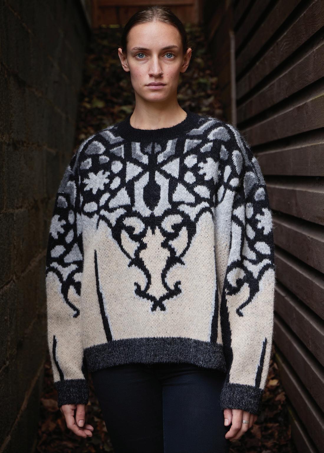 “I’m drawn to humble objects, like those we hide in the attic or put on display.” From this came “Bracket,” a sweater design inspired by a simple, Victorian-era bookshelf holder.