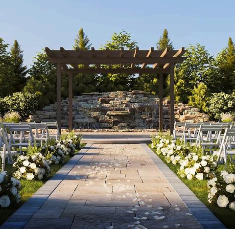 Couples can exchange vows on the landscaped lawn before celebrating in the elegant 2,200square-foot ballroom, designed with bright whitewashed walls and flexible décor options.