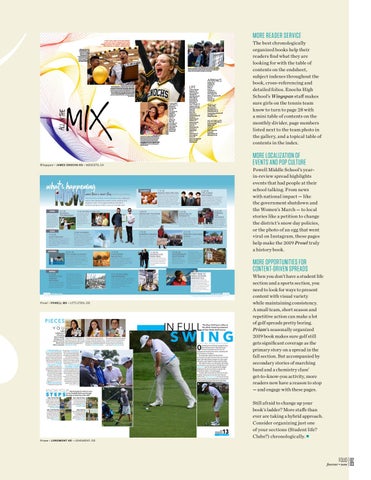 When you don’t have a student life section and a sports section, you need to look for ways to present content with visual variety while maintaining consistency. A small team, short season and repetitive action can make a lot of golf spreads pretty boring. Priam’s seasonally organized 2019 book makes sure golf still gets significant coverage as the primary story on a spread in the fall section. But accompanied by secondary stories of marching band and a chemistry class’ get-to-know-you activity, more readers now have a reason to stop — and engage with these pages. Still afraid to change up your book’s ladder? More staffs than ever are taking a hybrid approach. Consider organizing just one of your sections (Student life? Clubs?) chronologically.