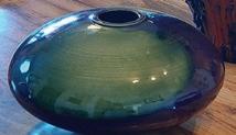 LEFT: CEREMANO squat ball vase, ‘Saturno’ décor. High-gloss blue-green glaze, Space Age design attributed to Hans Welling. Circa 1970s. RIGHT: Wilhelm Kagel Jr. Sienna studio vase (Mecklenburg, Germany) Circa 1950s.