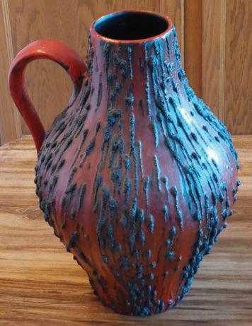 It is difficult to value a sizable collection, and I won’t presume to place a value on Peter and Marilyn’s collection – they are so much more knowledgeable about West German Pottery. We’ll look at one of their favourite pieces, a Ceremano vase with handle, shape 245, ‘Rubin’ décor (see photo), introduced in 1962, designed by Hans Welling.