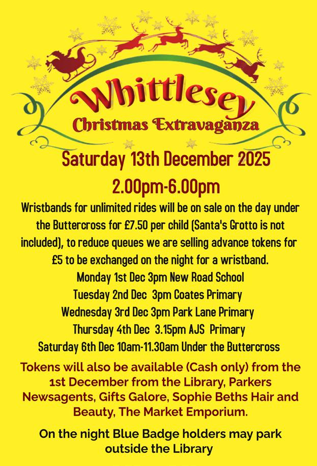 Wristbands will enable all local children to enjoy the fairground rides (height restrictions may apply for some rides). You can beat the queue and save money by buying tokens in advance to exchange for wristbands for just £5 (see the Facebook page, Whittlesey 2025 Christmas Extravaganza, for sales venues). Alternatively, wristbands can be purchased on the day for £7.50 from under the Buttercross on the Market Square.