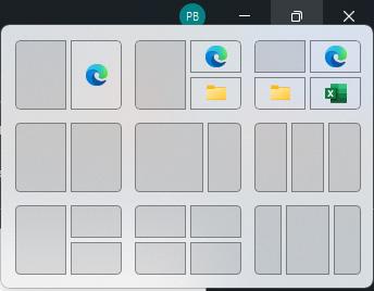 sides and corners for half and quarter-screen layouts, Windows 11 has added a hover menu over the Maximize button that offers layout options. You can choose from various layouts depending on the size of your display. Click to select your preferred formation and then move your apps into place.