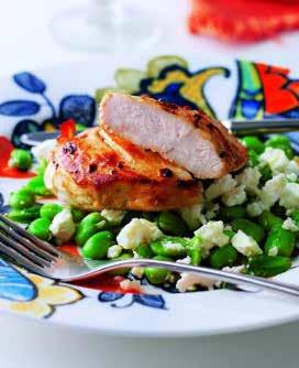 3 Heat a frying pan over a high heat and brown the chicken breasts until both sides are golden, then transfer to a roasting tin and roast for 5-10 minutes, or until cooked. Serve immediately, sliced in half, with the minted broad beans and feta.
