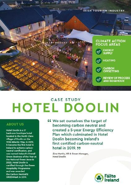 Hotel Doolin is a certified carbon neutral hotel in Co. Clare. In 2017, the on-site carbon footprint of the hotel was 461 tonnes and by 2021, the on-site carbon footprint had been reduced to 68 tonnes.