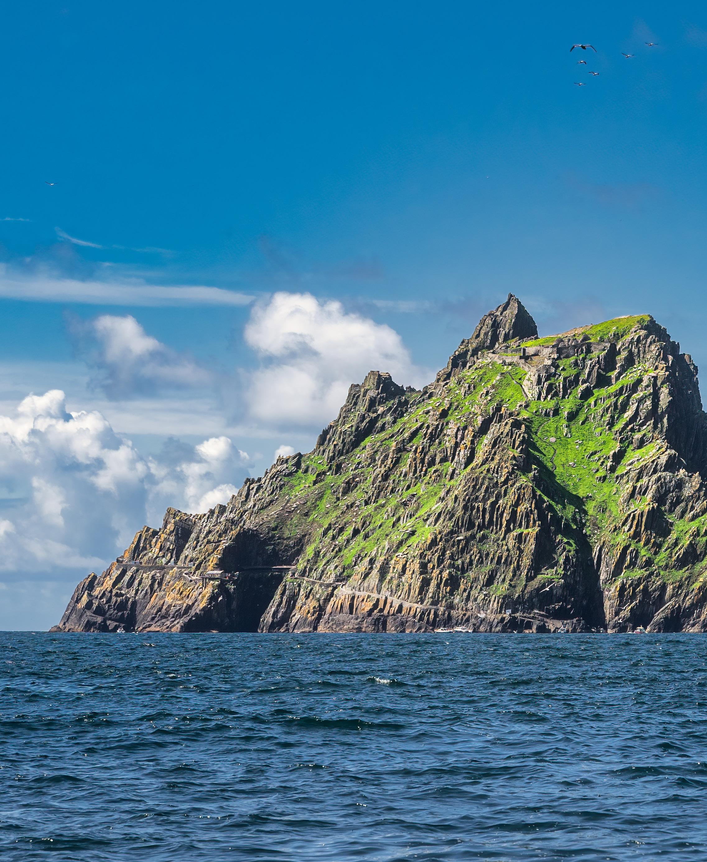 Rock steady on Skellig Michael, Co Kerry. Opposite: Skellig Six18's gin infused with locally sourced botanicals.