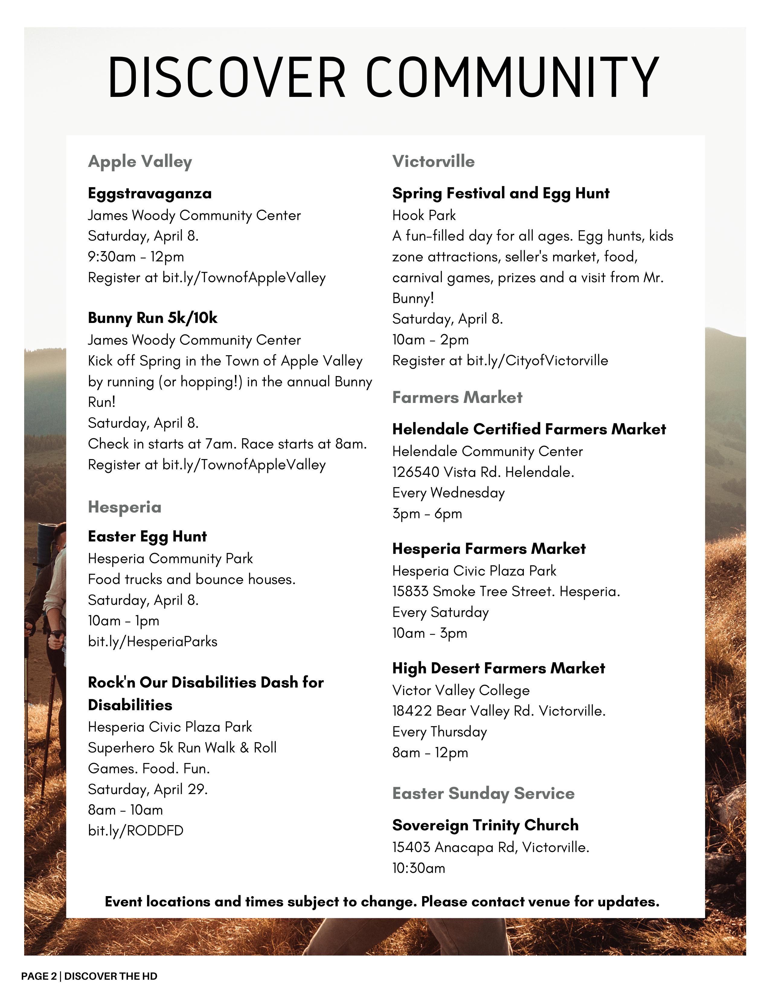 Discover Community - Community Easter Egg Hunts and Spring Festivals in the High Desert. Discover The Ranch Steakhouse in Phelan serving breakfast, lunch, dinner, desserts and hand crafted drinks. Victor Valley College is hosting the largest hiring event in the High Desert. Discover Small Business - Tacos Al 100% and Tonyan Coffee.
