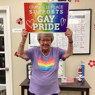 Pictured is resident Maryann B. proudly displaying our Granville Pride sign.