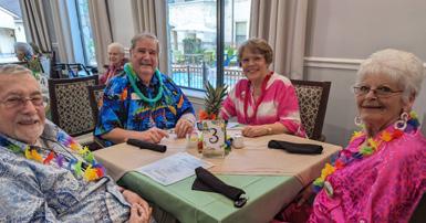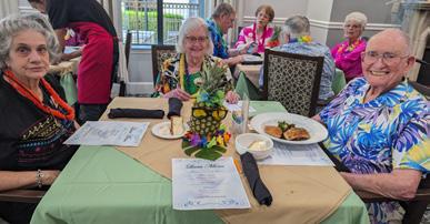 Our luau dinner party was a hit, featuring a ukulele player, a hula dancer, and delicious Hawaiian food and drinks that the residents thoroughly enjoyed.