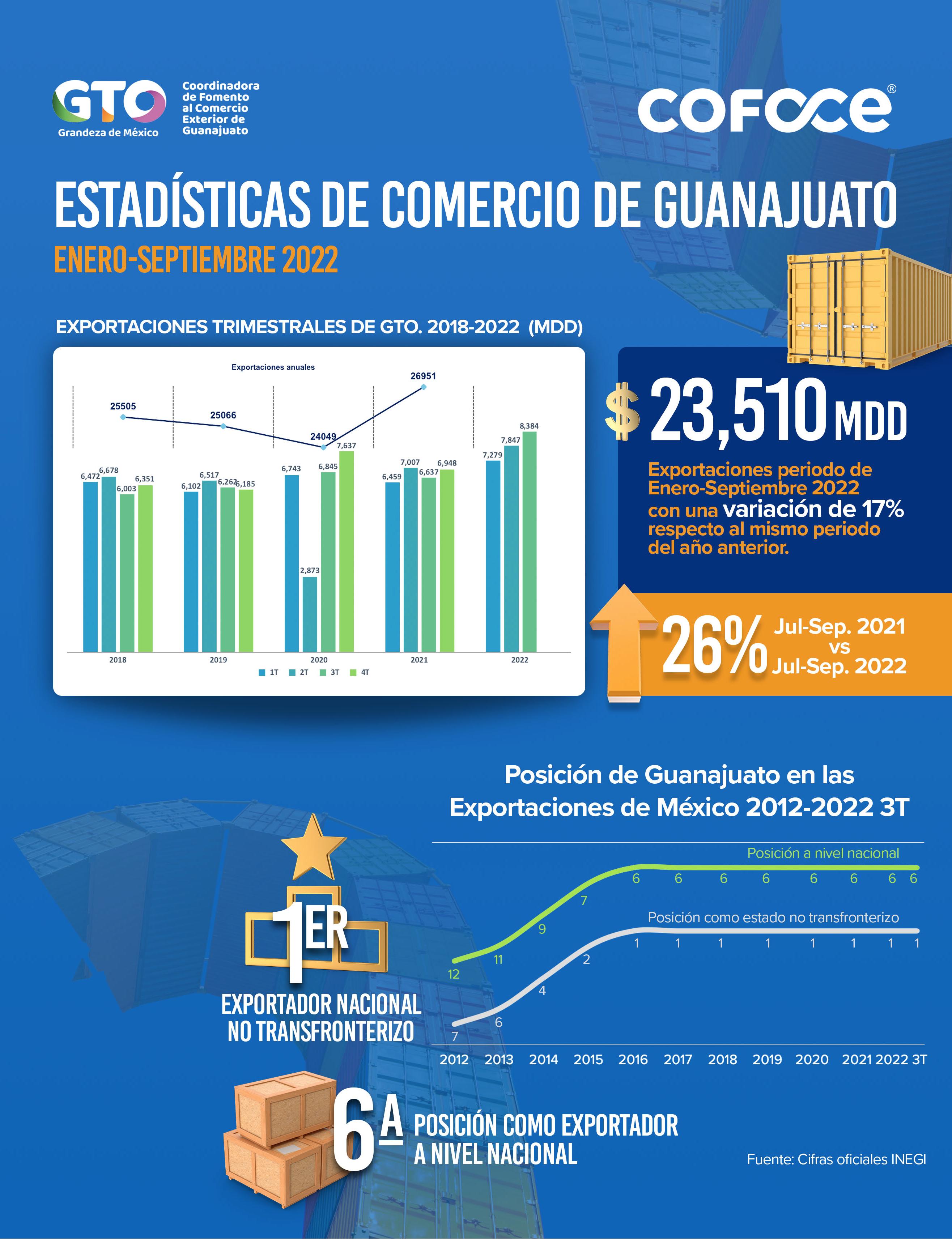 De enero a septiembre del 2022, de acuerdo con cifras del INEGI, Guanajuato exportó 23 mil 510 millones de dólares lo que representa un 26 por ciento más en comparación con el mismo periodo del 2021.