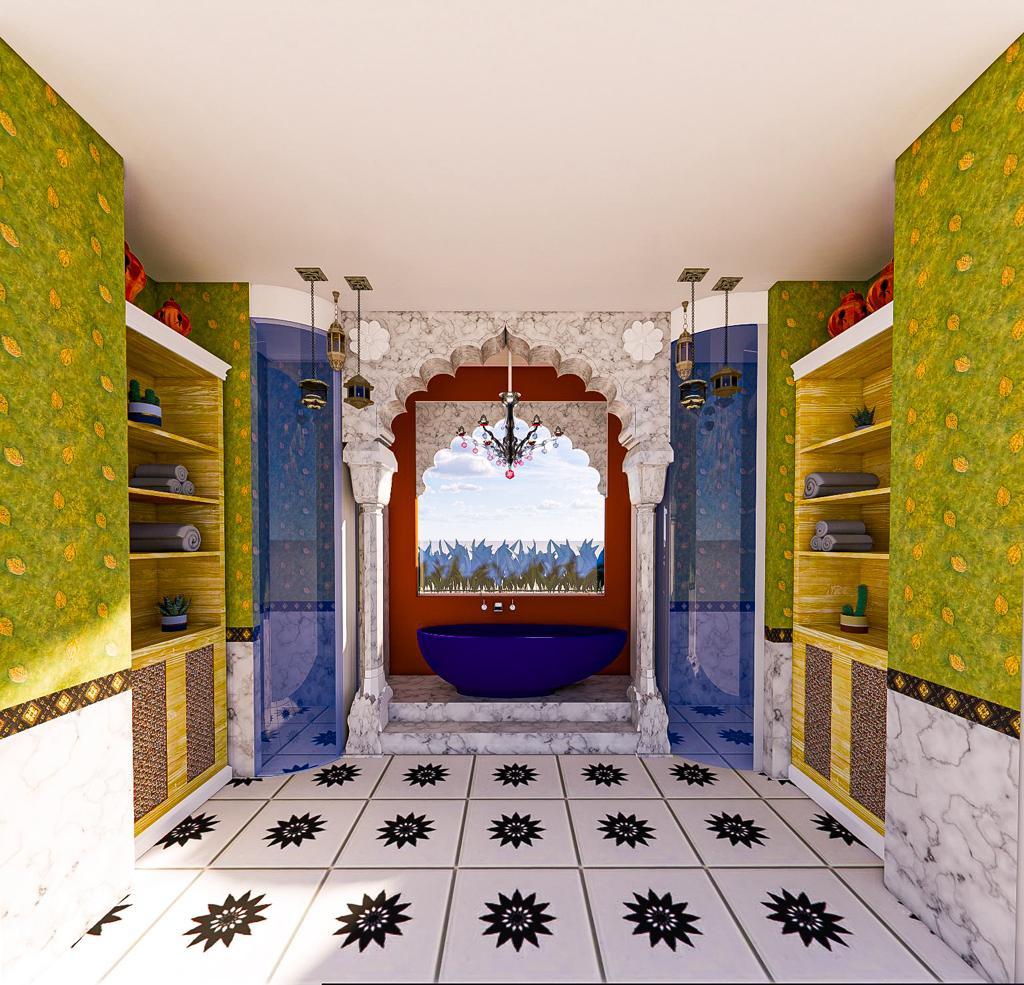 The concept of an Indian-Moroccan style bathroom is a captivating blend of two distinct yet harmonious design aesthetics, resulting in a luxurious and culturally rich spa space. Key features of this style include intricate patterns, vibrant colors , and ornate detailing. Traditional Indian architectural elements, such as intricately carved arches and decorative tiles. In an Indian-Moroccan style spa, expect to find luxurious elements like a beautifully crafted bathtub, porcelain tiles adorned with vibrant colors and elaborate patterns, and ornamental accents such as lantern-style lighting fixtures and mirrors. The fusion of warm Indian hues with the mesmerizing blues and greens of Moroccan design creates a visually stimulating atmosphere. This concept embodies a sense of opulence, cultural heritage, and exotic charm, offering a unique and indulgent bathing experience that transports individuals to the enchanting realms of both India and Morocco.
