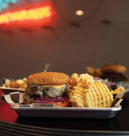 TRIO BURGER: RACLETTE CHEESE, PICKLED RED ONION, AIOLI, ARUGULA, POTATO BUN, WAFFLE FRIES
