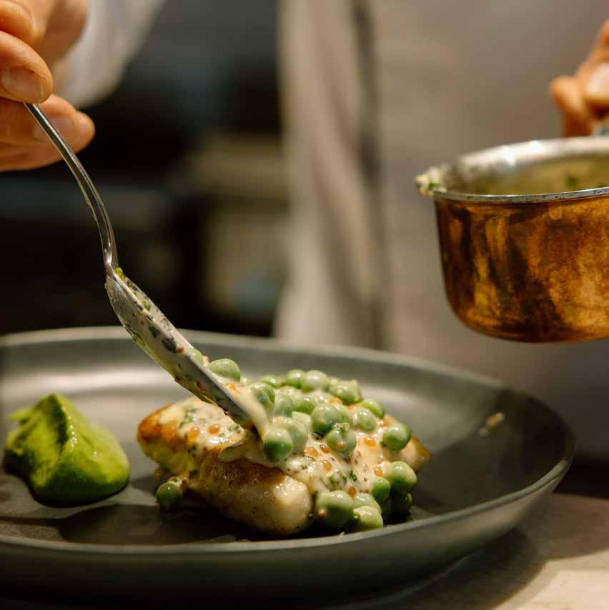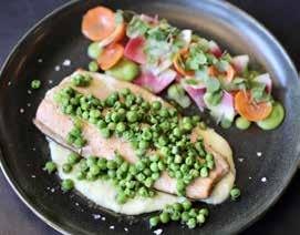 RAINBOW TROUT: PARSNIP PUREE, SHAVED RADISH, ENGLISH PEAS, HERB BUTTER