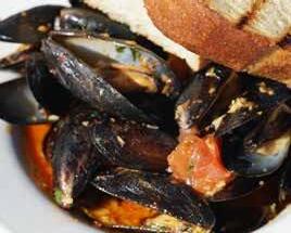 MUSSELS: SAUTÉED P.E.I. MUSSELS, WHITE WINE, GARLIC, ’NDUJA BUTTER, HEIRLOOM TOMATO, LEMON, PARSLEY, GRILLED 460 SOURDOUGH