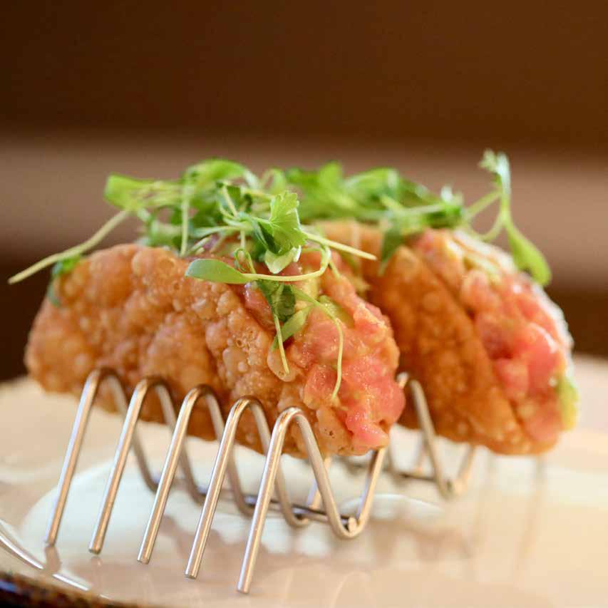 BLUEFIN TUNA TARTARE: TOMATO, EMERALD PLUM, TAPIOCA