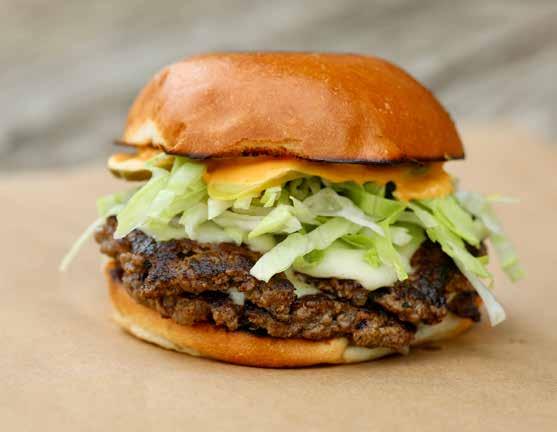 SMASH BURGER: BRIOCHE BUN WITH LETTUCE, TOMATO, CARAMELIZED ONION, CHEDDAR AND HOUSE BLUE CHEESE DRESSING