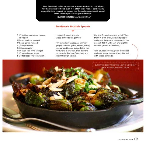 I love the scenic drive to Sundance Mountain Resort, but when I need an excuse to head over, it is often their food. I particularly enjoy the tangy sweet version of the Brussels sprouts and would make them if you could get the recipe. — HEATHER CARLTON, SALT LAKE CITY, UT