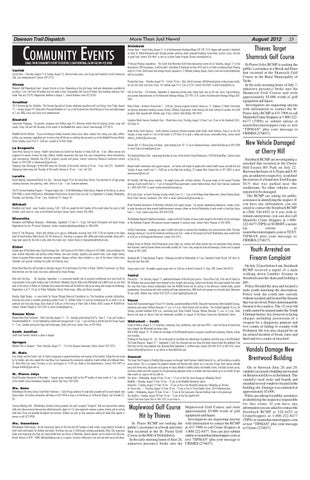 1st Annual Plowing Competition - The South East Manitoba Draft Horse Association invites all on Saturday, August 11 to the St-Pierre-Jolys RCMP is seeking the Association’s 30th anniversary. It will be held 1 mile West of Steinbach on Hwy #52 and ½ mi North on Keating Road. Plowing public’s assistance in a Break and Enter Carrick starts at 10 am. Draft horses and vintage tractors compete in 12 different plowing classes. Event is free and lunch/refreshments that occurred at the Shamrock Golf Carrick Days – Saturday, August 11 & Sunday, August 12, old-time town picnic, corn & pig roast hosted by Carrick Community will be available. Course in the Rural Municipality of Club. Live entertainment!! Contact 429-2113. Pioneer Day Camp - Monday, August 13 - 16 from 10 am – 3pm. Life of a pioneer, old fashioned games, make pioneer snacks, Tache. Giroux In the early morning hours of July 7, do arts and crafts and much more! For children ages 9-12. Cost is $120. Contact 326-9661 or email kimp@mhv.ca. Women’s Golf Networking Event - August 8 starts at 6 pm- Networking at the club house, food and refreshments available for unknown person(s) broke into the purchase, 7 pm- Tee Time! All golfers must be ready to start. Girouxsalem Golf Course (9 holes). Non-members welcome. Cost- Fall on the Farm - On Monday, September 3, experience harvest work, hearty food, corn on the cob, music, hog butchering, Shamrock Golf Course and stole Green Fees are $15.95. Registration deadline is August 1. Contact Raylene Snow 422-6234. and pioneer demonstrations at the Mennonite Heritage Village, 231 PTH 12 N. Contact the Mennonite Heritage Village 326- approximately $5,000 worth of golf 9661 . equipment and liquor. Grunthal Investigators are requesting anyone 2012 Hanover Ag Fair Schedule - The Hanover Agricultural Society celebrates agriculture and rural living. From Friday, August Rock & Read – At Anna‘s House from 1 - 2:30 pm. Summer program at Anna’s House no. 11- Highway 12 North. Free hands 17 – Sunday, August 19. Starts with a Pancake Breakfast at 7 am in the Puratone Tent. Barrel Racing at 3 pm and rodeo begins on learning experience teaching nursery rhymes, lullabies, finger-plays, book sharing and book making for parents and child with information to contact the Stat 7 pm. BBQ, music and much more entertainment. Pierre-Jolys RCMP at 433-7908 or call program. Best enjoyed with children ages 3-5yrs. Contact Cathy Bailley 346-0413. Kleefeld Canadian Blood Services Steinbach Clinic - Blood donor clinic, Thursday, August 16 from 2 pm- 8 pm at the Steinbach E.M.C. Community Playgroup - for parents, caregivers and children ages 0-5. Activities include time for playing, stories, songs and 422 Main St. snacks. Every 2nd and 4th Thursday of the month at the Kleefeld Rec Centre. Contact Irene Ascough 377-5013. Green Drinks South Eastman - South Eastman Transition Initiative presents Green Drinks South Eastman. Drop in on the 3rd Kleefeld Farmer’s Market - If you are looking for bread, brownies, butter, buns, cakes, cookies, fruit, honey, jam, jelly, muffins, Tuesday of every month at 7 pm at the Lecoka 5-275 Main St to grab a coffee and discuss sustainable living. Contact email pickles, pie, preserves, vegetables just to name a few off the top or anything else we want you at the Kleefeld Farmers Market. rebecca_hiebert@yahoo.com. Starts Tuesday, June 19 at 3 - 6:30 pm. Located at 76 Park Street. Seniors (60 +) Shinny Drop-in Hockey - every Monday from 10 -11 am at Centennial Arena. Contact Bob Barrow at 392-3596 La Broquerie or email bob.r.barrow@gmail.com. Seine River Services for Seniors- Health Centre/Centre de Santé from Monday to Friday 8:30 am - 4 pm. Offers services and programs for seniors. Income Tax help, Lifeline, mobility equipment, foot care, hair care, transportation, home maintenance, The Steinbach Rotary Club - meets every Monday at noon at the Smitty’s Family Restaurant, 145 Park Road West. Contact Cornie yard maintenance, Telecheck, the E.R.I.K. program, puzzles and games. Contact Community Resource Coordinator Juliette at 326-3155. Rowan at 424-5285 or labseinerss@gmail.com. Shopping Trips: Winnipeg’s St.Vital Mall every first Thursday of the month, leaving at 10 am - 3 pm. Cost $15. Steinbach’s Mental health information and support sessions - for family and friends of people with mental health issues are held the 2nd Clearspring Centre every last Thursday of the month, leaving at 10 am - 1 pm. Cost $10. Tuesday of every month from 7 – 8:30 pm at the Eden East building, 21 Loewen Blvd. Contact Kim at 371-0824 or email eastmanmss@mts.net Lorette Grand Opening Ceremonies/Family Fun Day - Saturday August 18 at the Seine River Church. Free activities for all age groups MS Monthly Self-Help group meeting - for people living with multiple sclerosis. The group meets on the second Thursday including bouncers, face painting, crafts. Starts at 3 pm - 7 pm. Everyone welcome. evening of each month from 6 - 7 pm at Fernwood Place apartments. Contact Nadine Konyk, Rural Client Services Coordinator at 1-800-268-7582 or email nadine.konyk@mssociety.ca. The TD Summer Reading Program – Program begins July 1 at the Bibliothèque Taché Library. Register at the library, by phone 878-9488, or email: btl@srsd.ca. Bibliothèque Taché Library Summer Hours are July 1 to September 4, Tuesday, Wednesday, MS Lunch Group- on fourth Thursday of every month, from 12 – 1 pm at the Village Green Restaurant. Contact Nadine Konyk, Thursday, and Saturday, 10 am- 2 pm. Closed July 21- August 10. Rural Client Services Coordinator 326-1434 or email nadine.konyk@mssociety.ca. Mitchell Mood Disorders Association of Manitoba individual and support groups - for persons experiencing depression, anxiety, stress, Breakfast and Social - every Tuesday morning, 7:30 - 9:00 am except the last Tuesday of the month when the social is held bi-polar disorder and other mental health/emotional concerns. Meets on the first Wedn