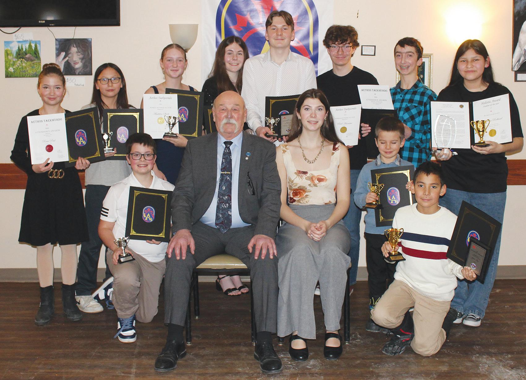Holistic Awards Group. Back row: Reese Paul, Felicity Mousseau, Madeline Steele, Angelina Bobrowski, Antony Bobrowski, Reid Ammeter, Grady Pelletier, Camryn Redhead. Front row: Frederik Kehoe, Master Lionel Bernier, Master Elisabeth Fust, Niklas Kovacs, Julian Bye.